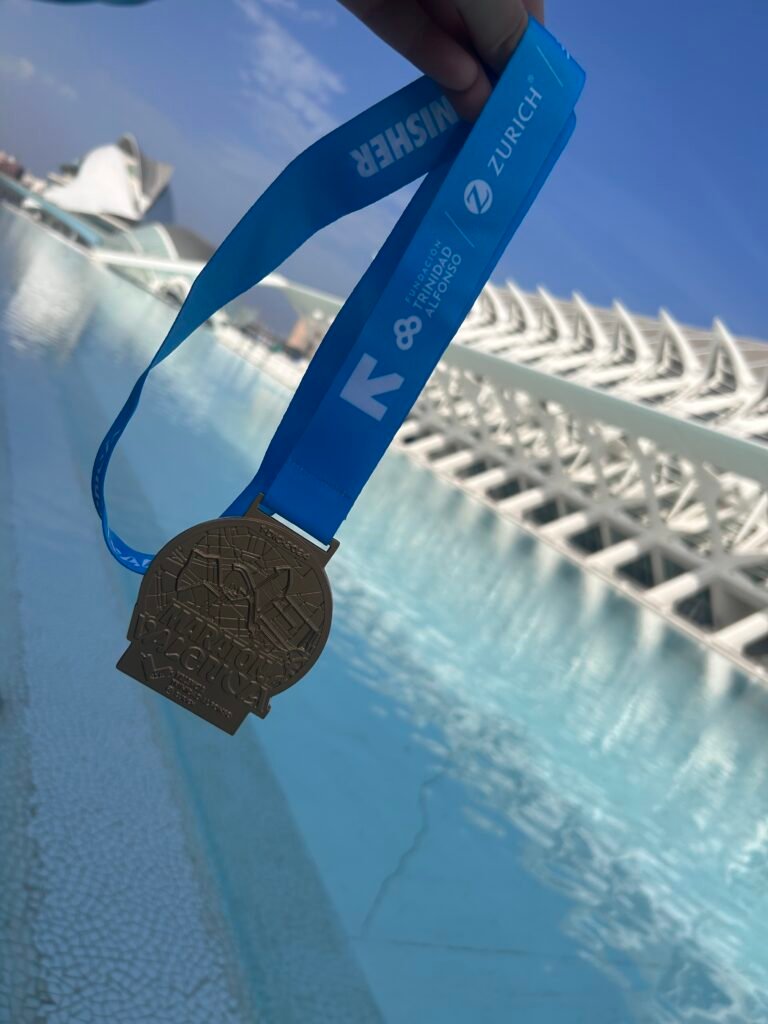 Llega la curva de Archiduque Carlos, cerca tengo a mi sobrino, me voy fijando pero no lo veo, esto hace que pasen los metros más rápidos, incluso te das cuenta de que estás acelerando, km38, 4:46, y lo ves, ahí está buscándote, le tiras el bidón que habéis quedado que el te recogía, te ofrece agua y es magia. Vas acalorado, te va de perlas, directa a la cara, al cuello y a las piernas. Hay que refrigerar el motor para que no se queme. Buen chute de energía, vuelve a la cabeza lo cerca que estás de meta, y cuando giramos hacia Avenida del Cid, sé que San Vicente está cerca, una vez lleguemos ahí prácticamente está acabado, los ánimos de la gente vuelven a crecer, empieza a haber más y más gente y ya no hay opción al pensamiento negativo. La calle Colón te parece que la haces a sprint, no paras de adelantar gente, la realidad es que vas al ritmo que has ido toda la carrera, 4:42 en el km 40. Pensar que tu hermana podía estar en la Calle Colón te hace acelerar, buscarla, no la ves, aunque luego te enterarás que sí que estaba. Sin verla te ha ayudado a pasar por ahí como un «rayo». Puerta de la Mar, pasillo estrecho y muchos gritos, corredores que se paran en seco, agudizas la concentración, sabes que tropezarte ahora lo tiraría todo al traste, a ver quien se levanta o vuelve a los ritmos. Tanto te has repetido que estás llegando que te has acelerado, km 41, 4:25, efectivamente te has pasado. Baja un poco porque se te están yendo las pulsaciones, pero… que narices si queda un km, estás a punto de girar para bajar ya hacia la alfombra azul, ahora no se para, se sigue y mañana ya si eso te arrepientes de este arreón. No sabes exactamente donde está, pero sabes que está, así que nada más pisar la alfombra te pones a buscar, menos de 2 segundos tardas en volver a ver esa mano en alto, gritando, no sabes lo que dice pero está gritando, seguro. Gesto de victoria al pasar por enfrente, lo hemos logrado, vamos a acabar y vamos a acabar con mejor tiempo de lo previsto. La alfombra es larga, incluso un pequeño repecho que podría no haber estado la verdad, es un simple escalón con rampa, pero te tensa desde el talón hasta la nuca. 300m finales, echas un ojo a la derecha, escuchas un «buena carrera», ostras tu, pero si es el chaval que he llevado de referencia durante varios kms. Cruzas la meta, gesto de rabia, de alegría, y de «pues ya está». Cruzas unas palabras de respeto y agradecimiento al compañero, te cuenta que él también te ha usado de referencia, y aunque es una tontería, es bonito. Él no lo sabe, pero te ha ayudado, tu no lo sabes, pero le has ayudado.
